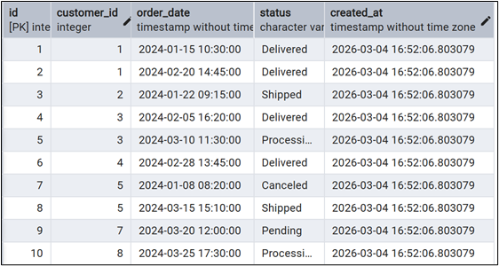 INSERT INTO orders (customer_id, order_date, status) VALUES