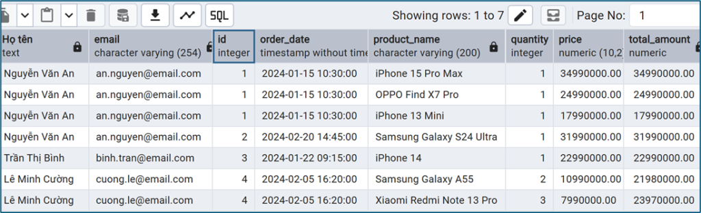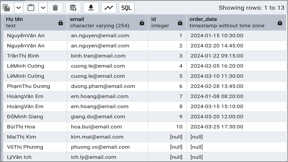 Ví dụ: Liệt kê chi tiết các chi tiết đơn hàng bao gồm tên, email khách hàng, mã đơn hàng, ngày thực hiện, tên sản phẩm, số lượng, giá sản phẩm, thành tiền (trong ví dụ giới hạn số lượng kết quả trả về để tiện theo dõi)