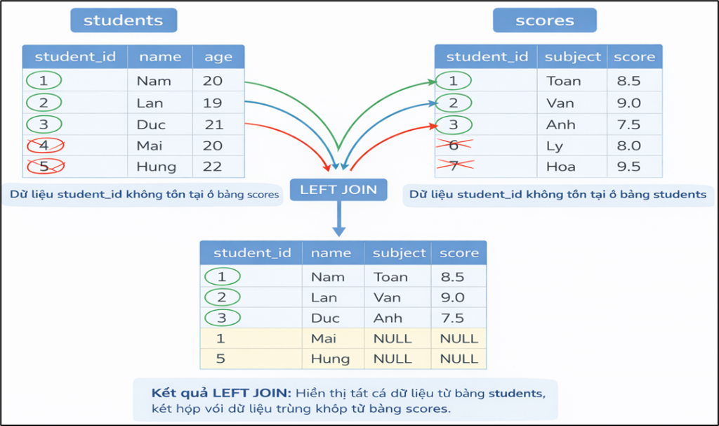 LEFT JOIN = “Giữ hết bảng trái; thiếu bên phải thì NULL.”