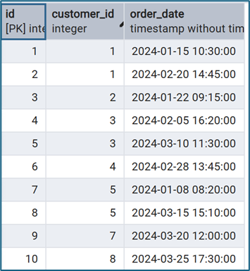 Tất cả customer_id trong orders đều tồn tại trong danh sách khách hàng (bảng customers), khách hàng có customer_id = 10, 9 không có đơn hàng nào