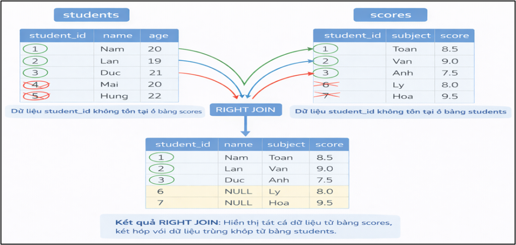 RIGHT JOIN giống LEFT JOIN nhưng đảo chiều. Cụ thể RIGHT JOIN lấy toàn bộ dữ liệu từ bảng bên phải, dữ liệu từ bảng bên trái chỉ lấy khi có khớp, nếu không khớp thì điền NULL. Cú pháp: