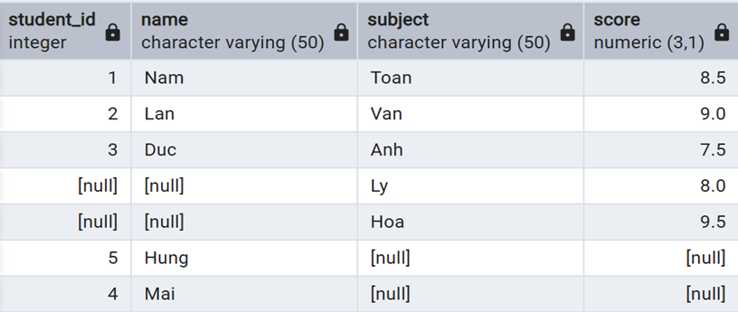 - bang1: bảng trái (LEFT), chỉ lấy khi trùng khớp nếu không sẽ điền NULL