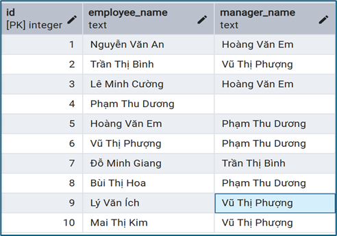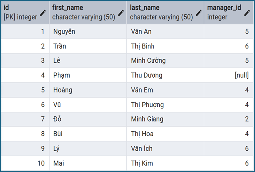 Tình huống điển hình: dữ liệu phân cấp như nhân viên – quản lý. Bảng employees có manager_id trỏ về emp_id trong cùng bảng.