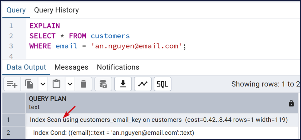 PostgreSQL đang sử dụng index idx_customers_email để tìm dữ liệu thay vì quét toàn bộ bảng.