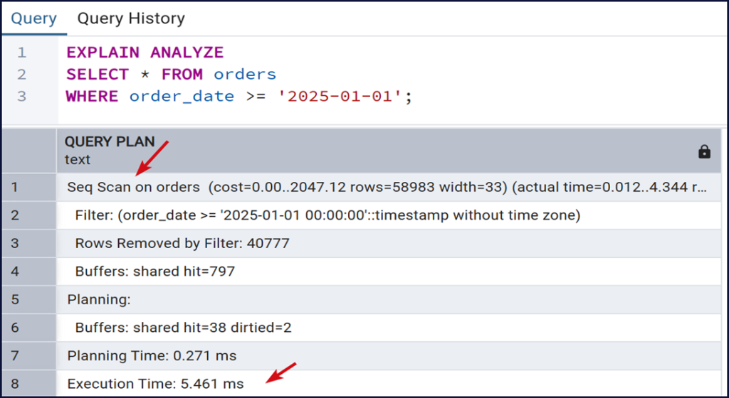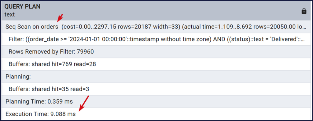 Seq Scan on orders nghĩa là PostgreSQL quét toàn bộ bảng để tìm các dòng thỏa điều kiện. Execution Time là thời gian thực thi thực tế của truy vấn.