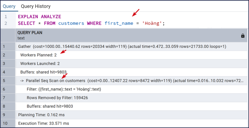 Màn hình cho thấy PostgreSQL chia thành 2 worker để quét toàn bộ bảng.