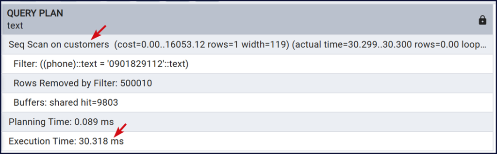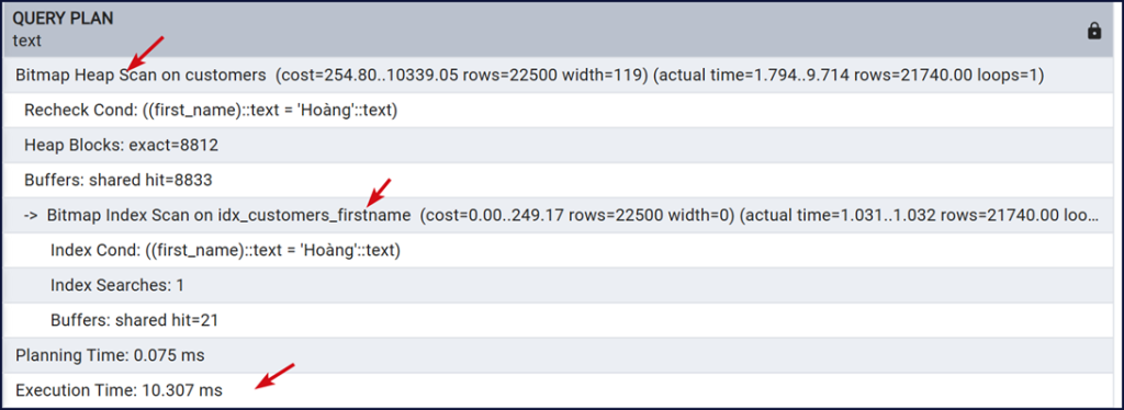 Seq Scan on customers tức là khi tìm kiếm, PostgreSQL sẽ quét toàn bộ bảng. Nếu index được dùng nó sẽ hiện Bitmap Index Scan / Index Scan / Bitmap Heap Scan.