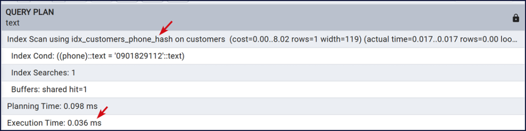 Màn hình cho thấy PostgreSQL dùng index chúng ta vừa mới tạo, phương pháp scan là Index Scan không dùng Seq Scan toàn bảng nữa. Execution Time cho thấy thời gian thực thi truy vấn đã giảm.