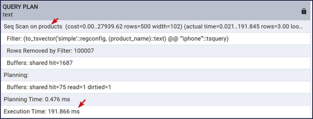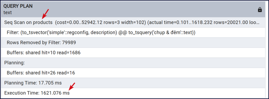 Seq Scan on products tức là quét toàn bộ bảng. Execution Time tương đối lớn vì PostgreSQL phải quét toàn bộ bảng.