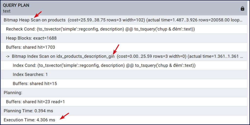 Seq Scan on products : Cho thấy PostgreSQL quét toàn bộ bảng. Còn nếu index được dùng nó sẽ hiện Bitmap Index Scan / Index Scan / Bitmap Heap Scan