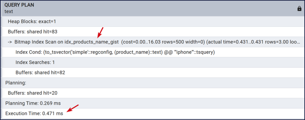 Màn hình cho thấy PostgreSQL dùng index chúng ta vừa mới tạo, phương pháp scan là Bitmap Index Scan không dùng Seq Scan toàn bảng nữa. Execution Time cho thấy thời gian thực thi đã giảm.