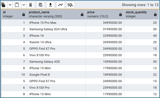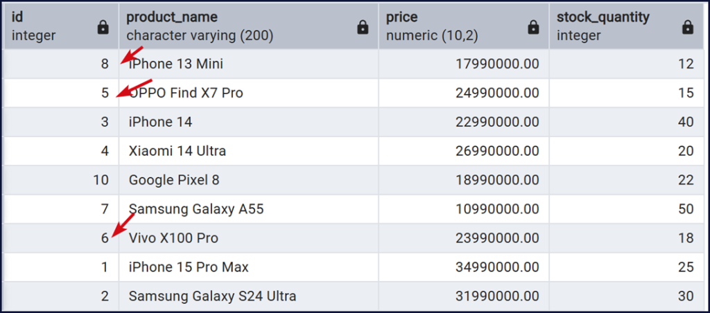 SELECT id, product_name, price, stock_quantity