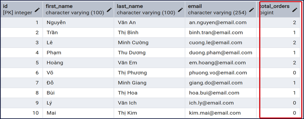 Trong truy vấn này, mỗi dòng là một khách hàng và cột total_orders được tính bằng cách đếm số đơn hàng tương ứng trong bảng orders. Điểm hay của kiểu này là giúp có thêm chỉ số tổng hợp.