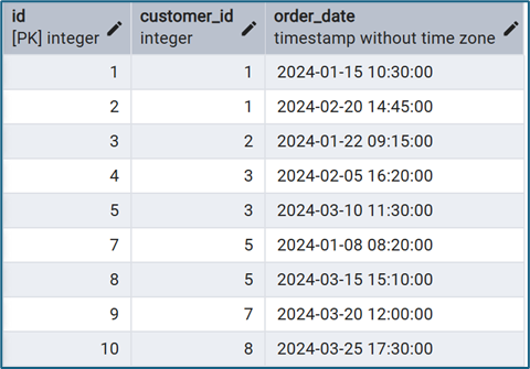 SELECT id, customer_id, order_date