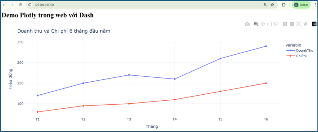 Sau đó, bạn mở địa chỉ local bằng cách Ctrl + click vào http://127.0.0.1:8050/. Lúc này, một web app đơn giản sẽ xuất hiện. Ứng dụng này hiển thị biểu đồ Plotly có tính tương tác. Bạn có thể hover, zoom, pan và bật tắt chuỗi dữ liệu. Cách làm này rất phù hợp khi bạn muốn phát triển dashboard nội bộ, ứng dụng AI private hoặc sản phẩm web public.
